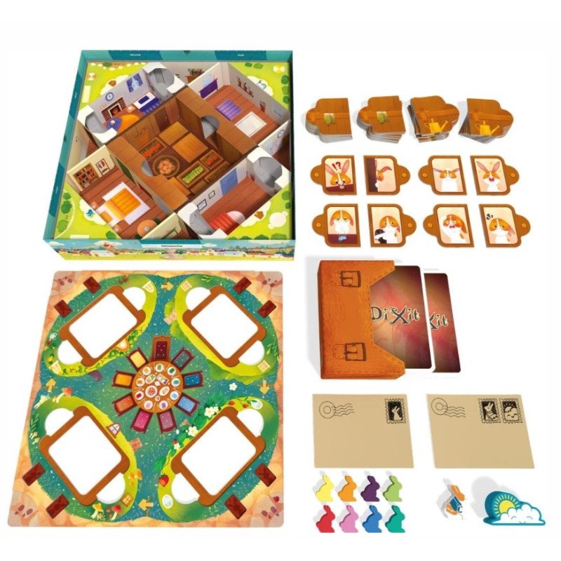 La boite de jeu contient 84 cartes Dixit, 8 pions Lapin en bois, 32 tuiles Porte, 1 sacoche de factrice, 1 pion Factrice en chef, 1 pion Soleil, 1 plateau de jeu et la règle du jeu.
