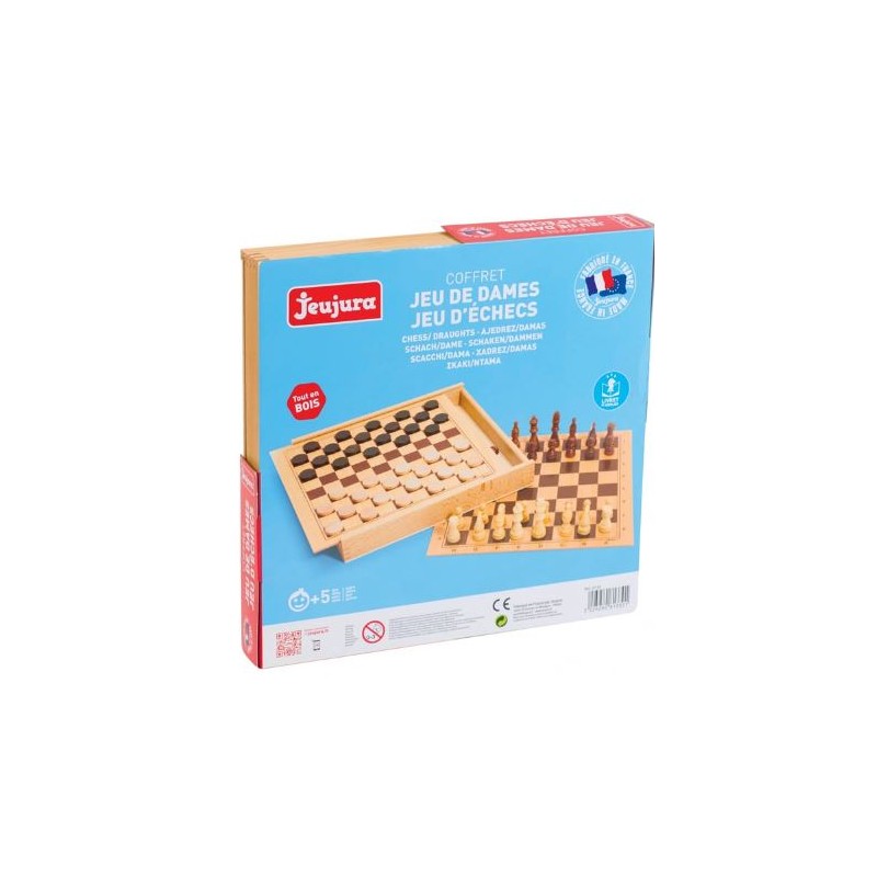 Découvrez le coffret d'échecs et de dames de Jeujura, un coffret en bois des célèbres jeux de stratégie fabriqué en France. Un magnifique jeu à double emploi pour jouer en famille ou entre amis.