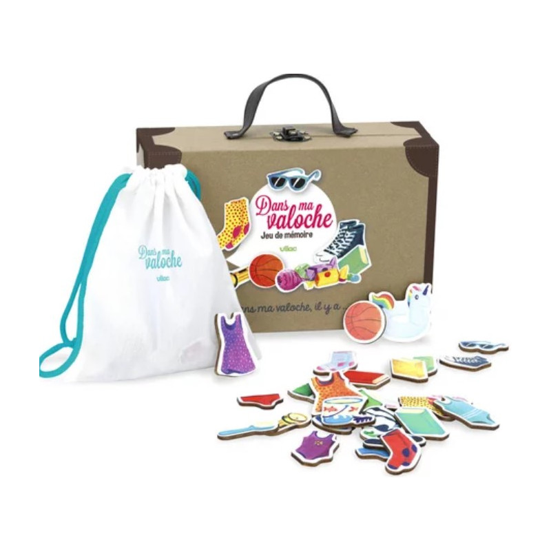 Découvrez le jeu de mémoire Dans ma valoche de Vilac, un jeu de société pour jouer en famille dès 3 ans. Vilac revisite ce jeu de mémorisation oral que tout le monde connait : « Dans ma valise, il y a... ».