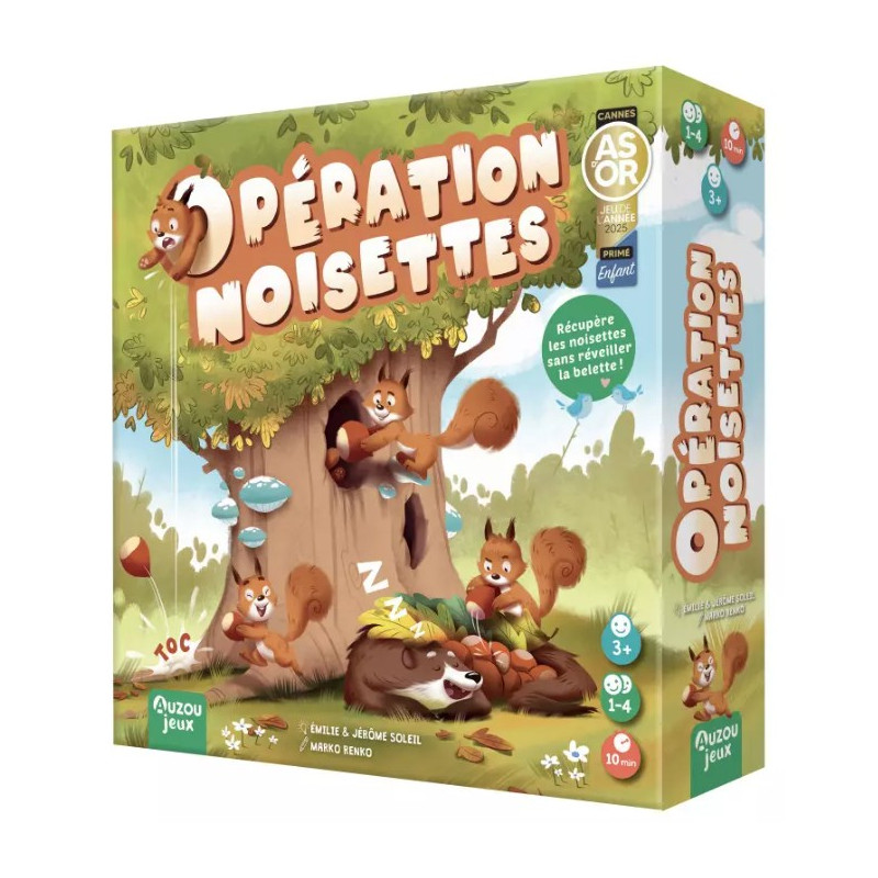 Opération Noisettes est un jeu de société collaboratif pour enfants à partir de 3 ans dans lequel vous devrez récupérer des noisettes et les déposer dans l'arbre sans réveiller la belette. Il permet à l'enfant de travailler sa concentration et son habilité sonore.