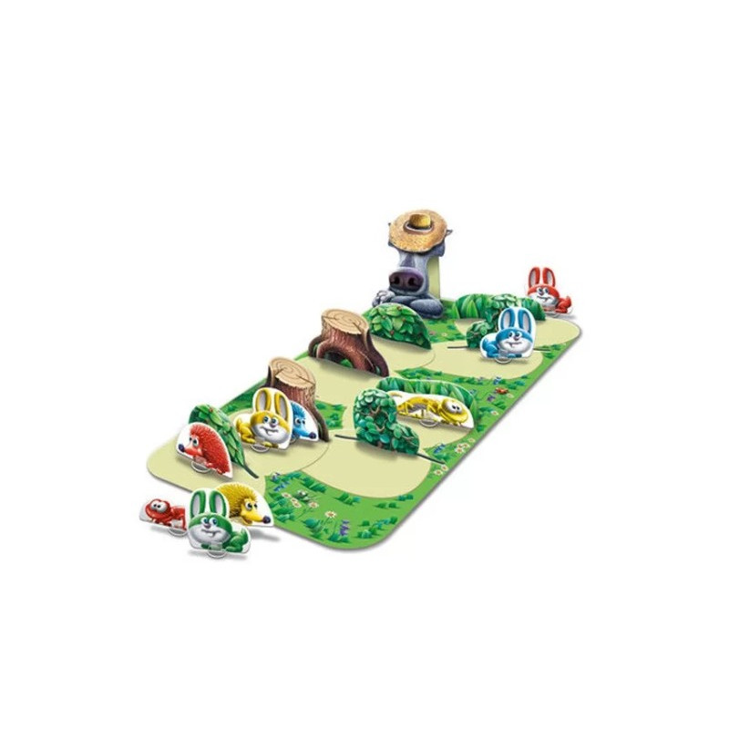 Le jeu contient 1 plateau de jeu, 12 animaux (4 sets de 3), 4 morceaux de chemin (buissons et souches), 1 loup avec un chapeau,1 dé et la règle du jeu.
