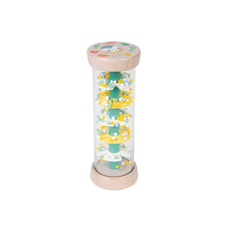 Découvrez le bâton de pluie de la collection Pure de Janod, un jouet d'éveil sonore et visuel pour les enfants à partir de 6 mois. Un bâton de pluie transparent avec 5 hélices en bois de 2 formes différentes et des billes en plastique.