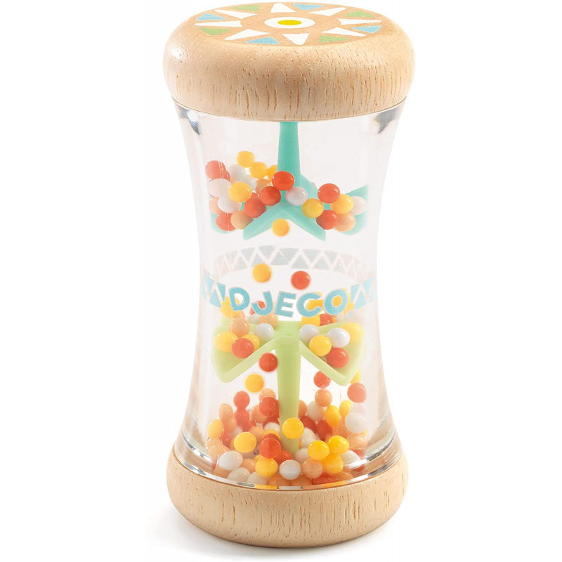 Après l'avoir retourné, il contemplera les petites billes tomber et émettre un son comme de la pluie. Un hochet aux couleurs pastel, facile à prendre en main et à secouer.