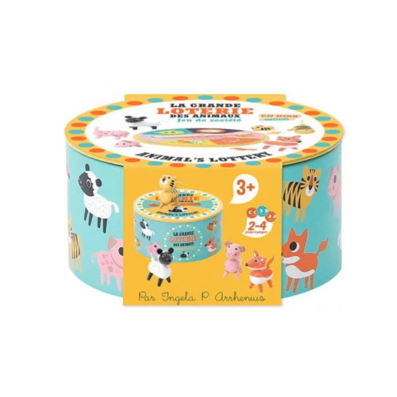 Découvrez le jeu La grande loterie des vaches de Vilac illustré par Ingela P. Arrhenius, un jeu de hasard en bois pour les enfants à partir de 3 ans où le but du jeu est de reconstituer son animal en premier parmi un renard, un mouton, un cochon ou un tigre.