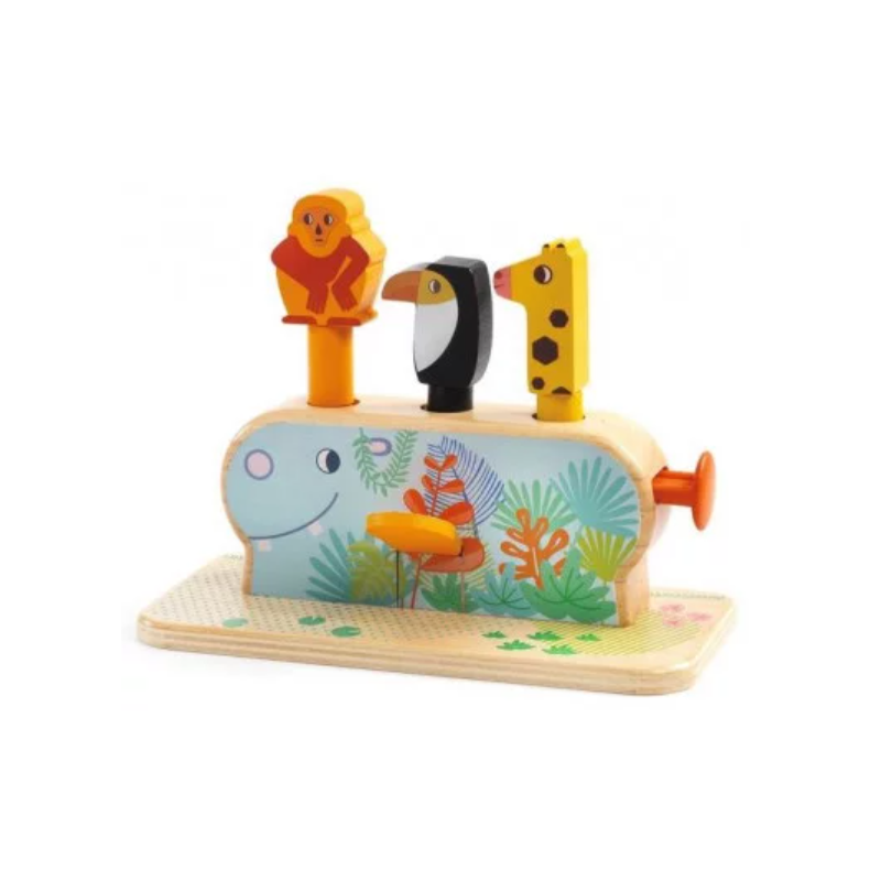 Votre bout de chou va s'amuser à placer les animaux dans les trous, puis à appuyer sur la tête du singe pour le faire bondir, à taper sur le levier pour faire sauter le toucan et à pousser le poussoir pour faire jaillir la girafe. Les sauts des animaux amuseront et feront rire votre bébé et vous allez voir ses yeux s'émerveiller!
