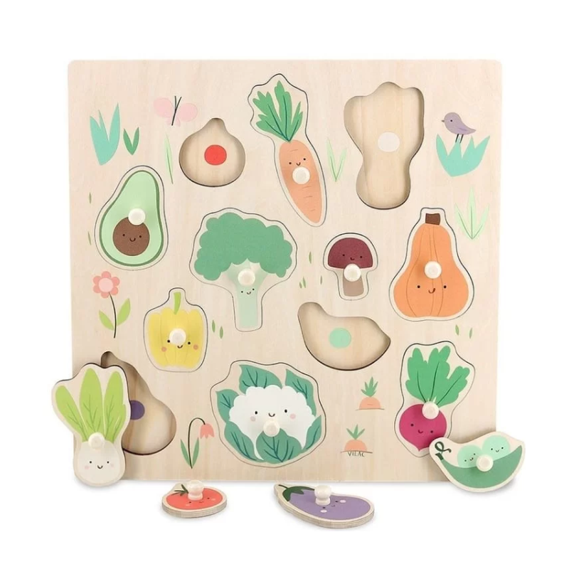 Découvrez le puzzle d'encastrement boutons bois légumes de Vilac, un magnifique puzzle en bois sur le thème des légumes dessiné par Sarah Betz pour les enfants à partir de 18 mois.