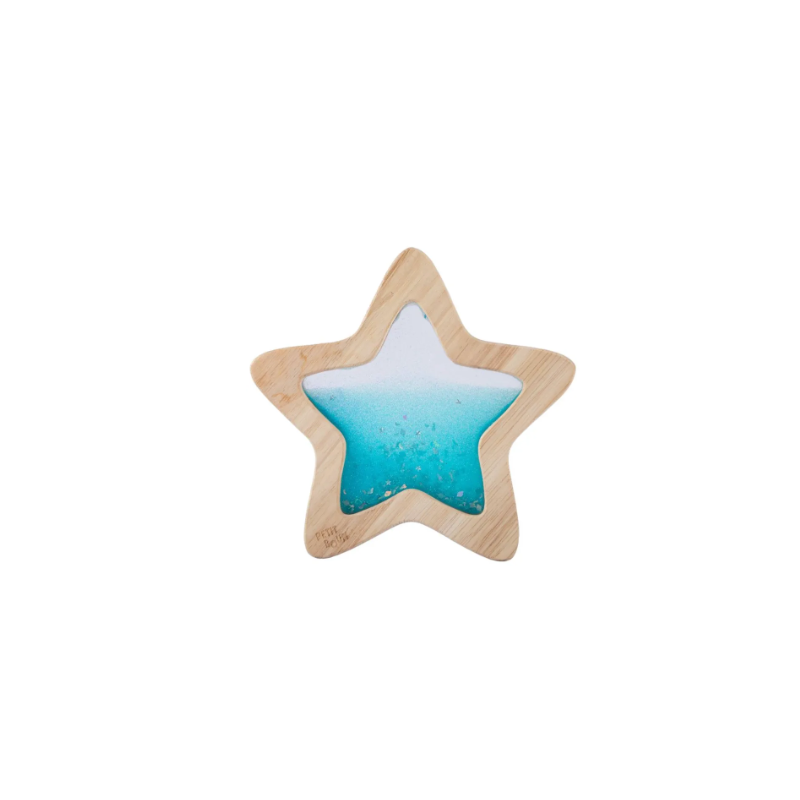 Découvrez l'étoile sensorielle Orionis de Petit Boum, une activité d'éveil pour les enfants dès 6 mois avec cette étoile flottante autour de la couleur bleue, contenant du liquide coloré, des paillettes et du fluides fluorescents qui brillent dans le noir.