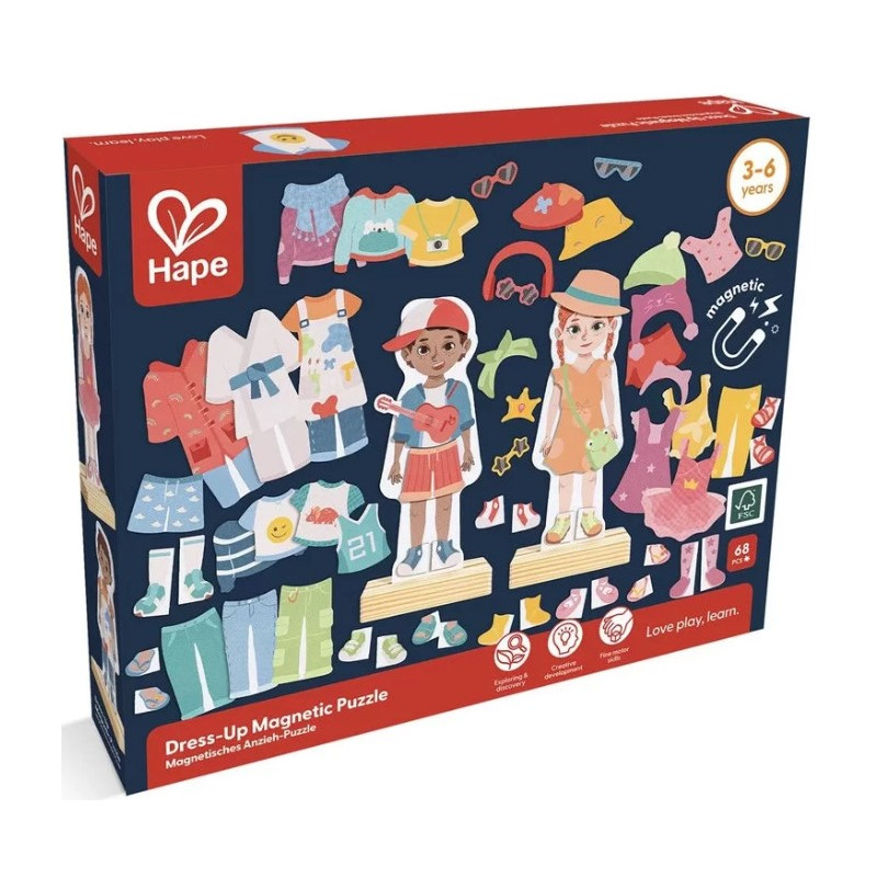 Découvrez le coffret Je m'habille avec mes vêtements aimantés de Hape, un jeu magnétique permettant aux enfants de 3 à 6 ans d'habiller des figurines à l'aide de vêtements et d'accessoires magnétiques.