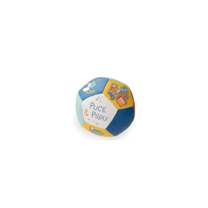 Découvrez la balle souple de la collection Puce & Pilou de Moulin Roty, un petit ballon coloré tout léger pour amuser bébé. Une balle souple en vinyle pour jouer à l'intérieur comme à l'extérieur de la maison, avec des faces colorés et illustrées avec les personnages de la collection.