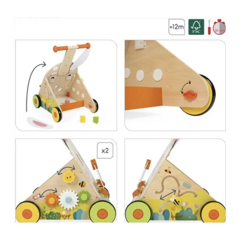 Doté de roues silencieuses et d’un système de frein breveté par Janod, ce chariot assure sécurité et praticité avec ses trois positions : libre, ralenti et arrêt total, parfaitement adaptées aux besoins de chaque étape d’apprentissage.