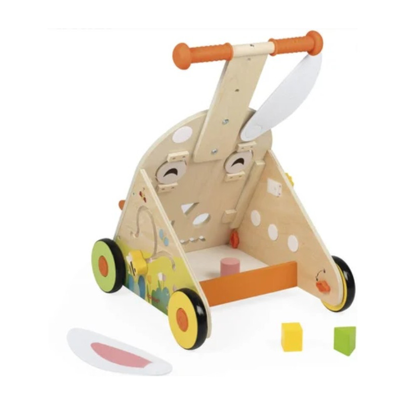 Découvrez le chariot de marche Lapin de Janod, un jouet en bois à pousser pour apprendre à marcher et pour éveiller les enfants dès 12 mois.