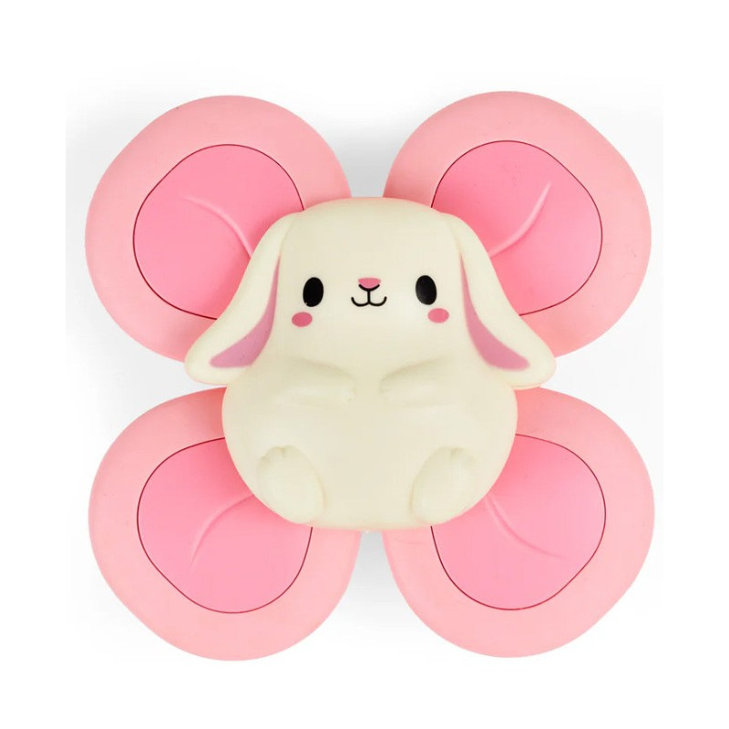 Conçu pour encourager la motricité fine, le jeu sensoriel et l'apprentissage par cause à effet, ce jouet présente un adorable lapin équipé d'un élément de rotation à quatre palettes. Une solide ventouse permet de le fixer facilement à toute surface lisse (baignoires, carreaux, chaises hautes, miroirs, réfrigérateurs et vitres de voiture).