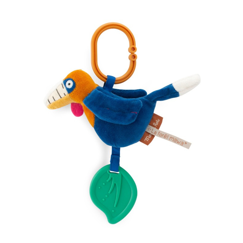 Un oiseau Calao coloré à suspendre avec une clochette dans son ventre et des ailes qui font scritchent. Il porte également un jouet de dentition en forme de feuilles.