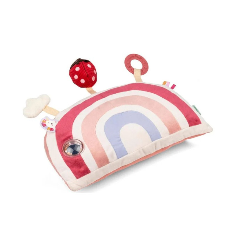Découvrez le coussin d'activités Léna de Lilliputiens, un jouet en tissu en forme d'arc-en-ciel aux tons rose parfait pour éveiller les bébés dès 3 mois.