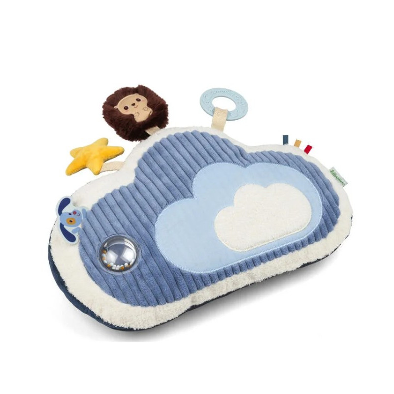 Découvrez le coussin d'activités Jules de Lilliputiens, un jouet en tissu en forme de nuage aux jolis tons bleus parfait pour éveiller les bébés dès 3 mois.