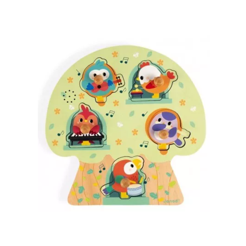 Découvrez le puzzle musical les oiseaux en fête de Janod, un puzzle en bois de 5 pièces à tenons à encastrer, idéal pour les petits avec de grosses pièces pour découvrir les sons des instruments. Un puzzle ludique de 18 mois à 3 ans.