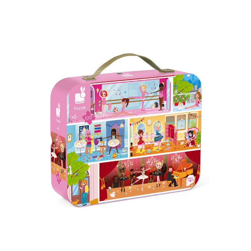 Voici le puzzle Danse académie de Janod, un puzzle carton de 100 pièces sur le thème de la danse, présenté dans une jolie valisette ronde, facile à transporter grâce à sa poignée tissu. Poster inclus.
