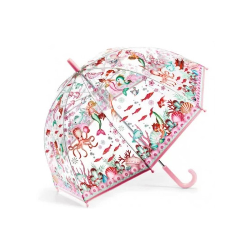 Découvrez le parapluie Sirène de Djeco, un magnifique parapluie illustré en plastique transparent et effets argentés pour égayer les jours de pluie. Un parapluie coloré avec des sirènes pour mettre de la couleurs les jours de pluie à partir de 5 ans.