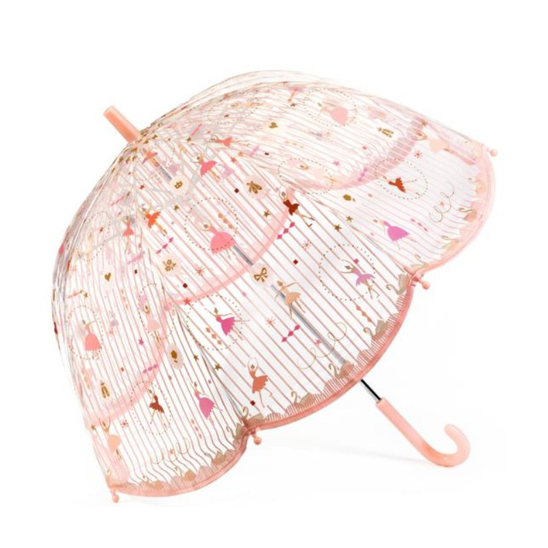 Découvrez le parapluie Ballerine de Djeco, un magnifique parapluie illustré en plastique transparent pour égayer les jours de pluie.