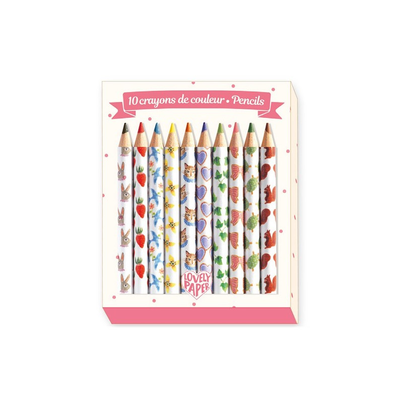 Voici les crayons de couleurs Aiko de la collection Lovely Paper par Djeco, pour les enfants à partir de 6 ans. Vous trouverez à l'intérieur de cette boite 10 mini crayons de couleurs illustrés.