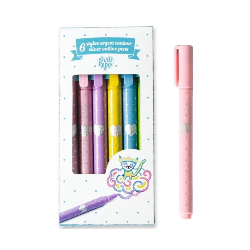 Découvrez les 6 stylos argent contour de Lovely Paper by Djeco, un étui de 6 stylos argentés avec contour pour écrire, dessiner et pour sublimer vos créations avec de jolies couleurs : rouge, jaune, vert, bleu, rose et violet.