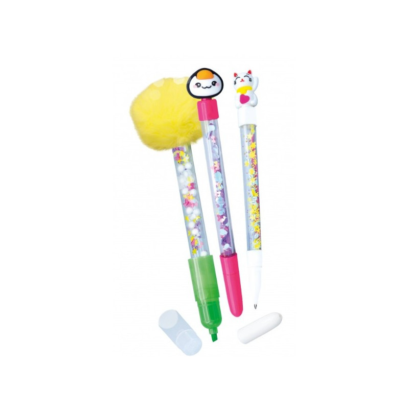 Remplis les stylos et le surligneur avec toutes les décorations, puis choisis une figurine ou un pompon. C’est magique : si tu frottes avec la figurine, l’encre des stylos s’efface!