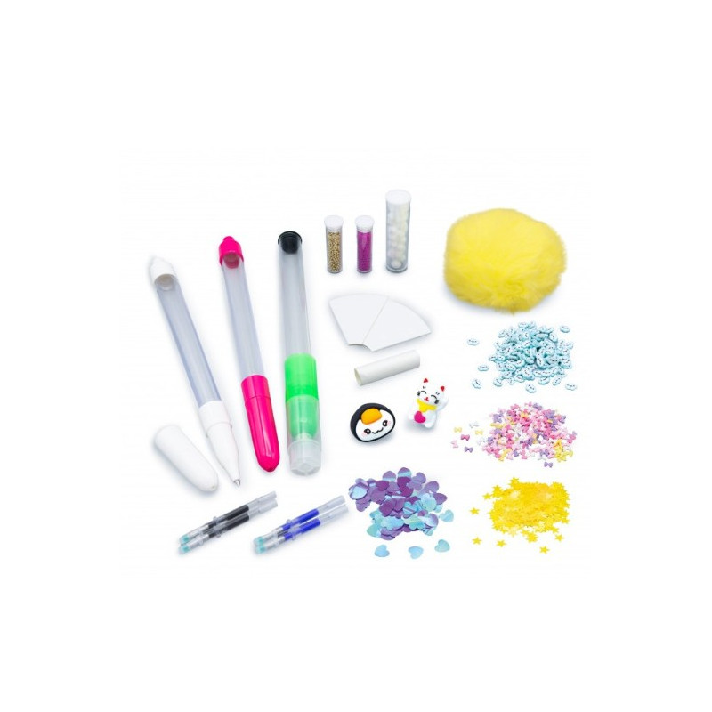 Le coffret comprend 2 stylos, 1 surligneur, 4 mines d’encre effaçable (bleu et noir), 1 entonnoir, 2 figurines, des micro perles, 1 gros pompon, des accessoires, des petits pompons et 1 notice illustrée.