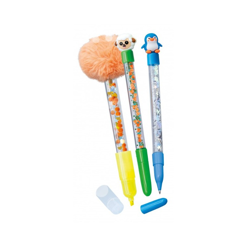 Remplis les stylos et le surligneur avec toutes les décorations, puis choisis une figurine ou un pompon. C’est magique : si tu frottes avec la figurine, l’encre des stylos s’efface!