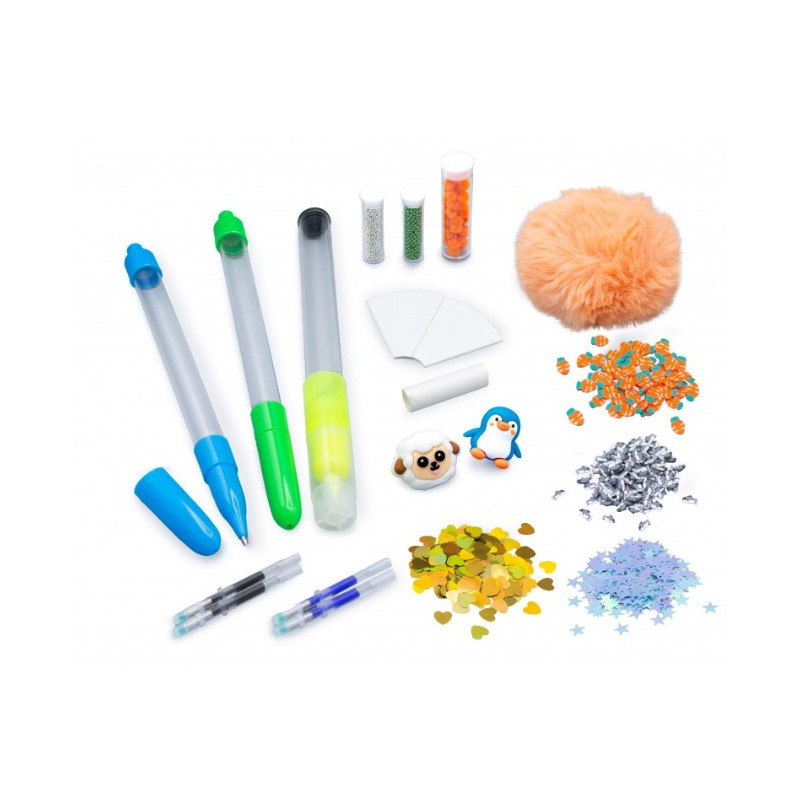 Le coffret comprend 2 stylos, 1 surligneur, 4 mines d’encre effaçable (bleu et noir), 1 entonnoir, 2 figurines, des microperles, 1 gros pompon, des accessoires, des petits pompons et 1 notice illustrée.