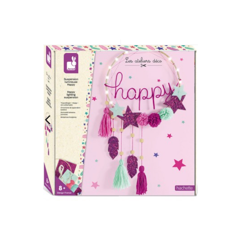 Voici le Kit Créatif Suspension lumineuse Happy de Janod pour confectionner une magnifique suspension lumineuse à confectionner sur un cercle en bois.