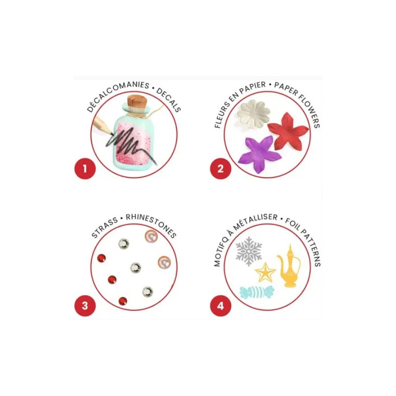 Ce coffret contient 4 tableaux, des décalcomanies, des fleurs en papier, 100 strass autocollants et des motifs à métalliser.