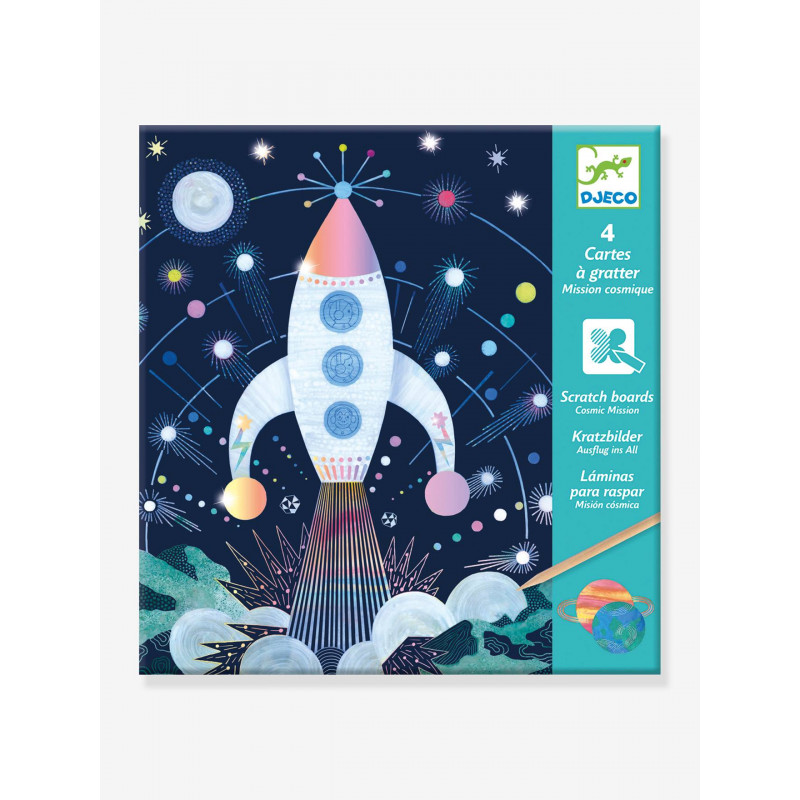 Découvrez les cartes à gratter Mission cosmique de Djeco, un loisir créatif ludique et original pour voyager dans l'espace. Une activité manuelle pour les enfants à partir de 6 ans avec 4 cartes à gratter avec un stylet.