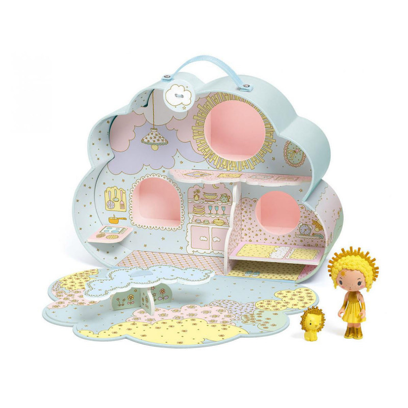 Cette jolie maison illustrée représentant un nuage est très facile à transporter grâce à sa poignée et s'ouvre pour y découvrir un décor de maison de poupées pour jouer avec vos figurines Tinyly. Dans cette jolie maison, vous y découvrirez un intérieur décoré avec une cuisine, des alcôves pour coucher vos figurines et une table pour manger.