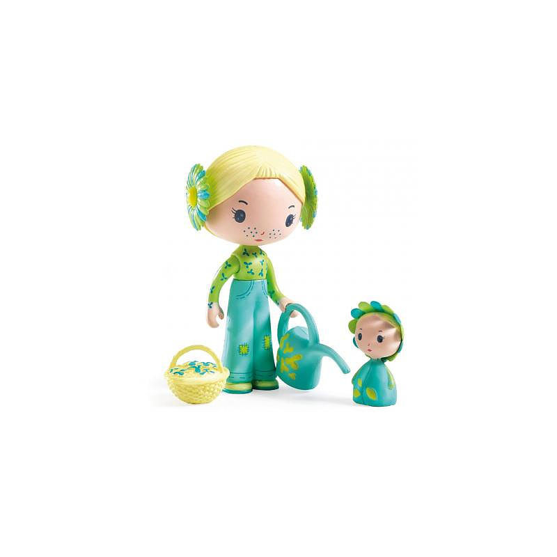 Deux figurines champêtre avec un personnage nommé Flore qui porte des fleurs dans ses cheveux et tient dans ses mains un arrosoir et un panier, ainsi qu'une jolie petite poupée fleur pour s'inventer de belles histoires.