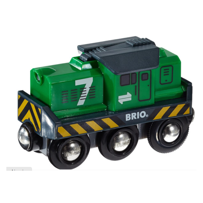 Découvrez la locomotive frêt verte à pile de Brio :De loin, vous verrez d’abord ses phares. Vous pourrez aussi l’arrêter ou choisir la marche avant ou arrière à tout moment en changeant le bouton de position.