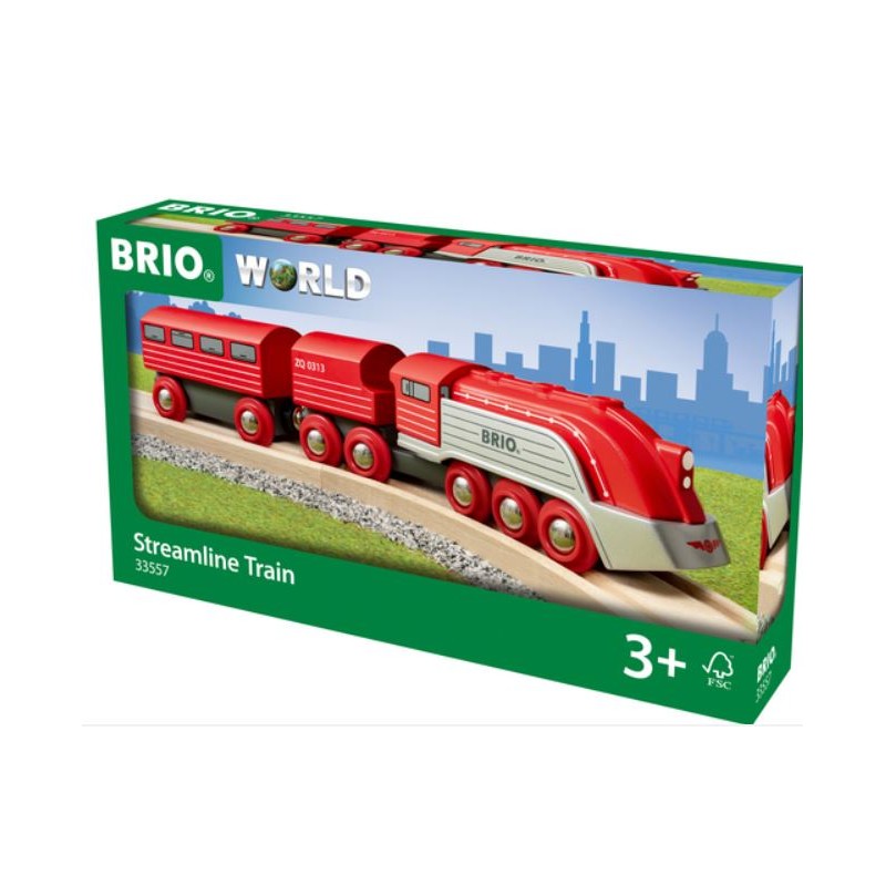 Train ludique et futuriste incluant deux wagons en bois de Brio, quatorze roues et de sublimes finitions rouges et argentées. L'un des plus longs trains du BRIO World avec un design unique inspiré des trains aérodynamiques du monde entier.