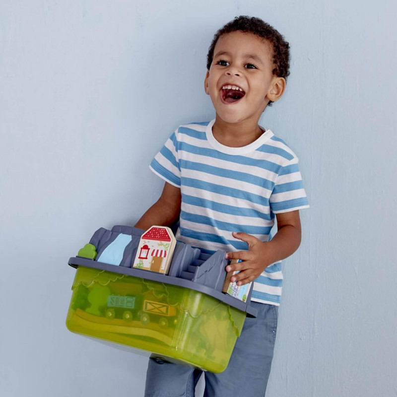 Facile à transporter et à ranger, la boite et son couvercle servent de pièces additionnelles pour créer de superbes circuits de train avec un personnage, des trains, des éléments de paysage, une grue, des panneaux...