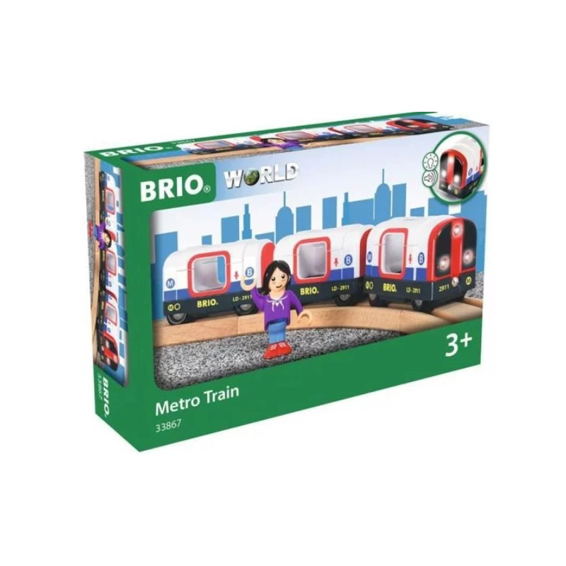 Sur les quais, une passagère attend son métro. Lorsqu’on pousse le train en avant il se met à produire le son du métro et ses phares s’allument. Ses trois wagons magnétiques peuvent rouler ensemble ou séparément. Dans la boîte, vous retrouverez le wagon de tête (avec effet sonore et phares lumineux), deux wagons et une passagère.