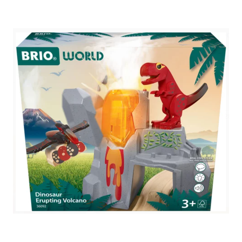 Un grondement, puis boom ! Le volcan Dinosaure en Éruption est sur le point d’exploser. Créez des aventures préhistoriques épiques en intégrant ce coffret et ces figurines sur le thème des dinosaures dans vos circuits Brio.