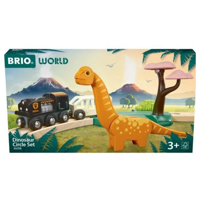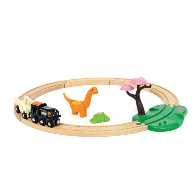 Ce circuit de train de 12 pièces de Brio sur le thème des dinosaures comprend une locomotive avec wagon, une figurine de dinosaure, un rail thématisé et des rails en bois.