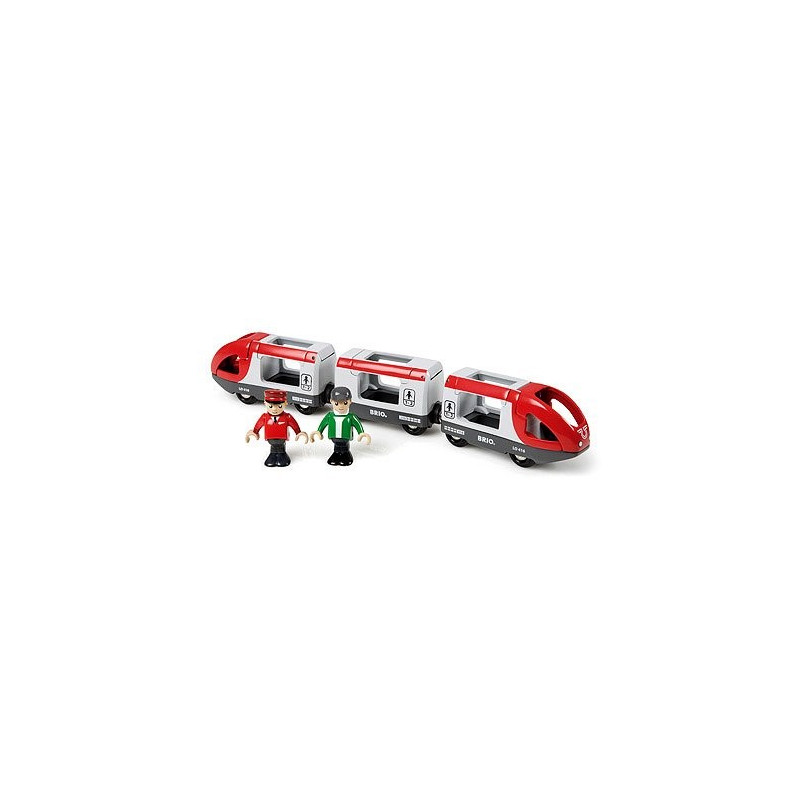 Brio vous présente le train voyageur. Il est composé de trois éléments et est livré avec un passager et un conducteur.