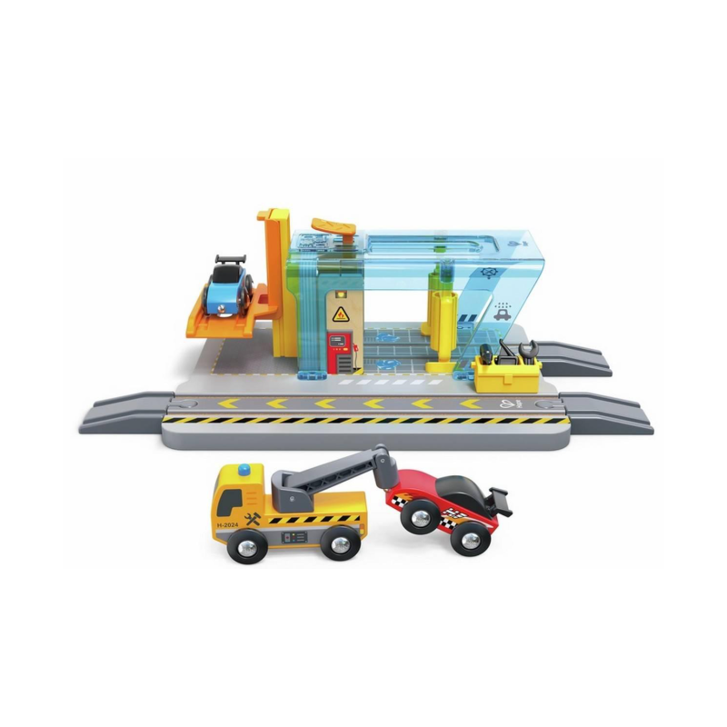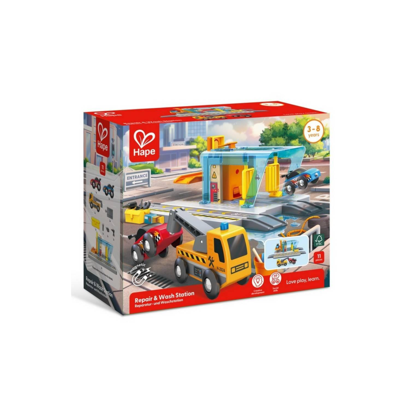 Découvrez la station de lavage et réparation de Hape, un jeu d'imagination pour mettre en scène de belles histoires. Un superbe coffret de jouets à offrir aux enfants dès 3 ans.