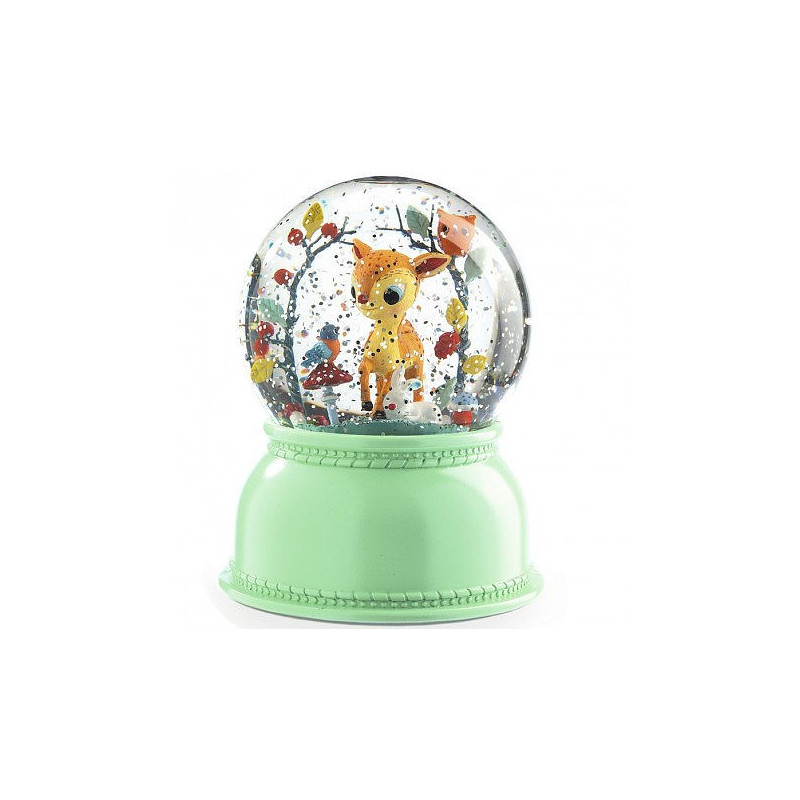 Cette veilleuse est également une boule neigeuse, nul besoin de la secouer, un mécanisme fait tournoyer les paillettes autour du faon et diffuse une douce lumière de différentes couleurs.