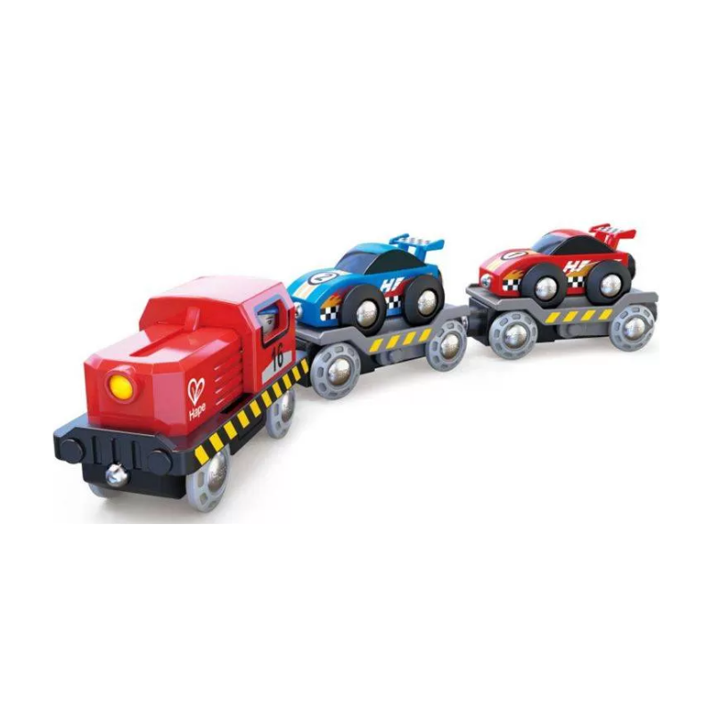 Pour compléter votre circuit de course en bois, voici le Transporteur de voitures de course de Hape pour charger et décharger les voitures près du circuit.