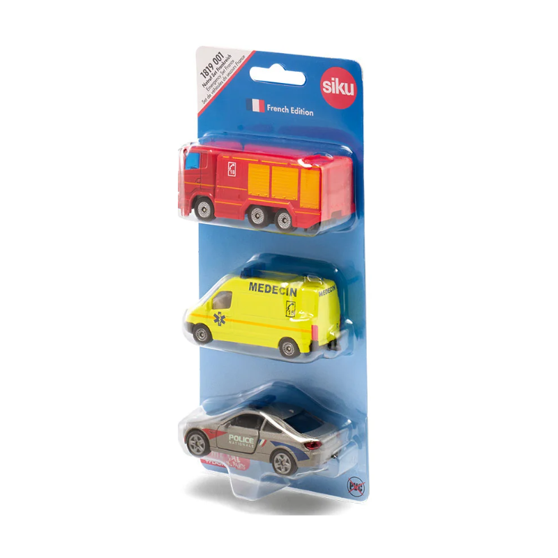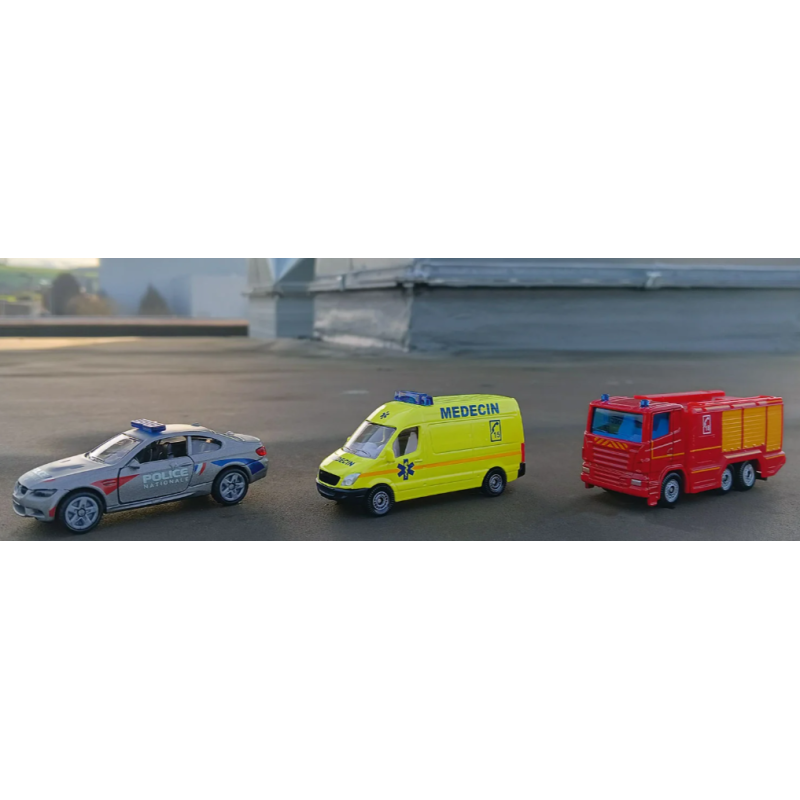 Voici le set de 3 véhicules de secours de Siku, qui comprend 3 véhicules : un camion de pompier, d'une camionnette de médecin et d'une voiture rapide de police.