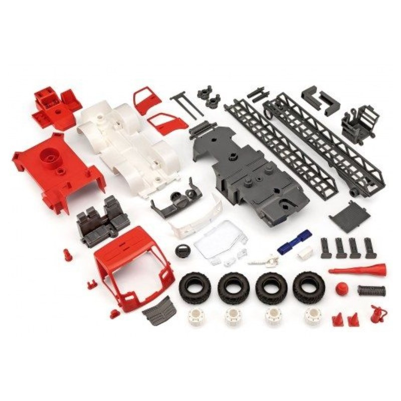 Des supports extensibles garantissent la stabilité du véhicule. La nacelle de sauvetage à lance d’eau mobile peut être dépliée et les portes qui s’ouvrent permettent de voir l’intérieur plein de détails de la cabine du conducteur. Des accessoires comme des pylônes et extincteurs viennent compléter le plaisir du jeu après l’assemblage.